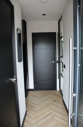 Als eerste is in de achtergevel ruimte gemaakt voor een (vergunningsvrije) uitbouw van 4 meter over de hele breedte van de woning. De houten benedenvloer is verwijderd en voorzien van een geïsoleerde balken-broodjes vloer. De uitbouw is neergezet met hout-skelet bouw. De indeling van de verdieping is naar wens ingevuld door ook met hout te werken. Een grote slaapkamer, een inloop garderobe, een kantoor en de badkamer zijn gerealiseerd. Ook is een vaste trap naar zolder geplaatst.